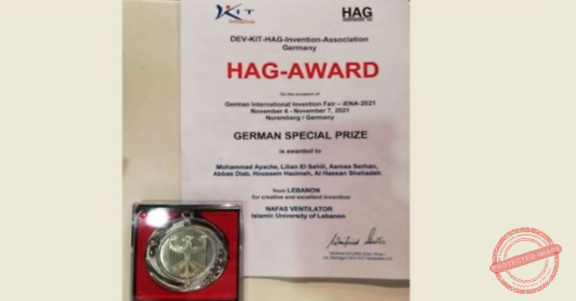 أعلنت الجامعة الاسلامية في لبنان الى أنها تواصل مسيرتها الاكاديمية نحو العالمية، ونالت جائزة التميز من لجنة المخترعين الألمان من خلال مشاركتها في المعرض الدولي الثاني والسبعين الصناعي للاختراعات والابتكارات IENA 2021 الذي اقيم في مدينة نورمبرغ الالمانية في الفترة الممتدة من 4 الى 7 تشرين الثاني 2021، عبر انجازها مشروع جهاز تنفس اصطناعي NAFAS VENTILATOR المصمم من اساتذة وطلاب من كلية الهندسة، المخصص لمرضى جائحة كورونا.