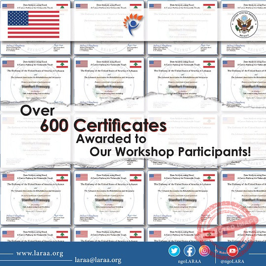 قامت جمعية LARA بتوزيع أكثر من 600 شهادة على مشاركين في برنامج” تحليل البيانات باستخدام Excel “Microsoftحيث شارك المستفيدون في جلسات تفاعليَّة وتمارين عمليَّة ودراسة حالات من الحياة الواقعيَّة التي تساهم في نمّوهم الشخصي والمهني.